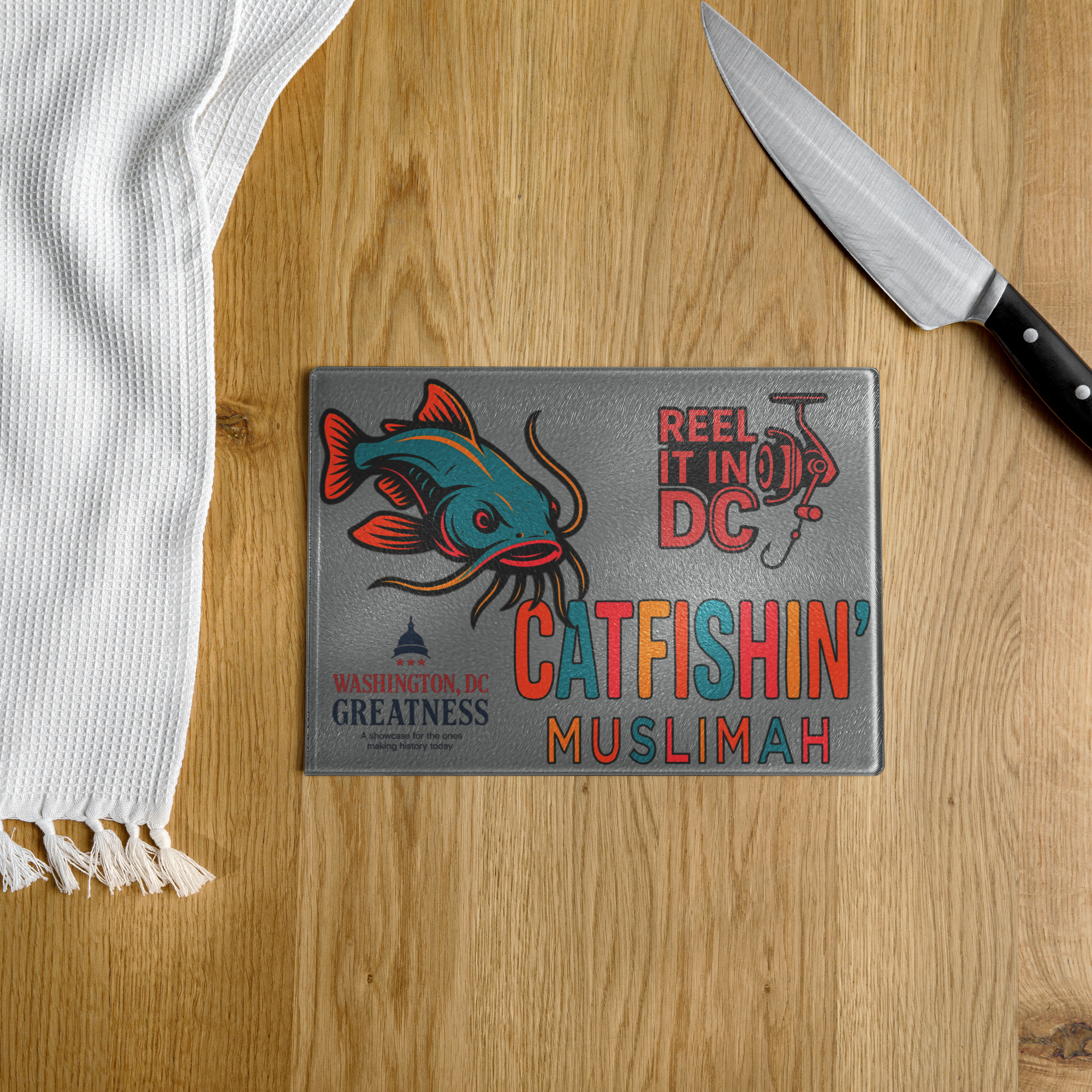Celebrate the flow of the city while cutting bait with pride. The “Capital Current” Bait Board is a DC Greatness collaboration that ties fishing culture to the energy of Washington, DC. Featuring the Reel It In DC image alongside Catfishin’ Muslimah’s dark-color logo, this special edition board is built for anglers who want gear that’s as bold as their catch. Durable, stylish, and functional, it’s perfect for bait prep on the boat, dock, or shore.