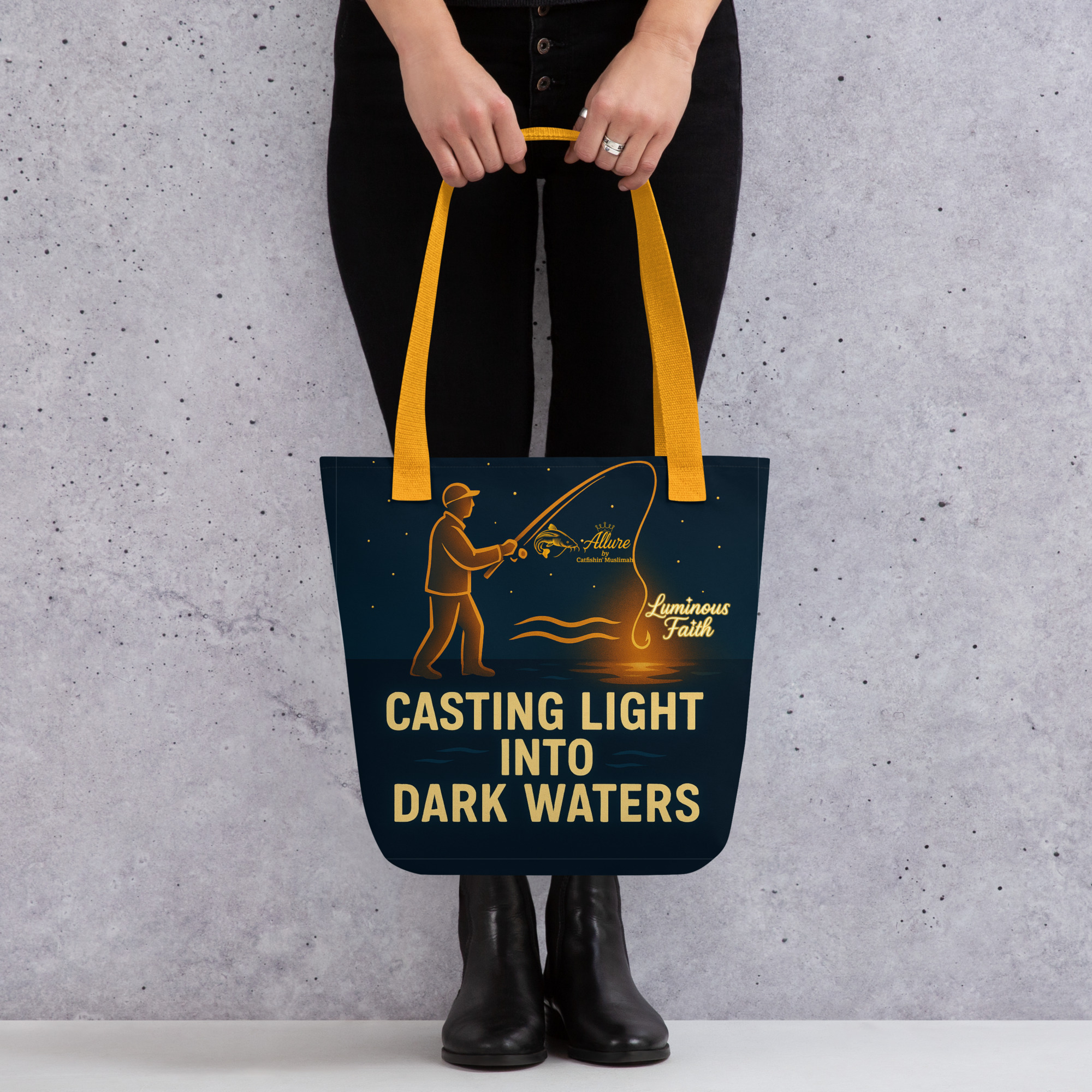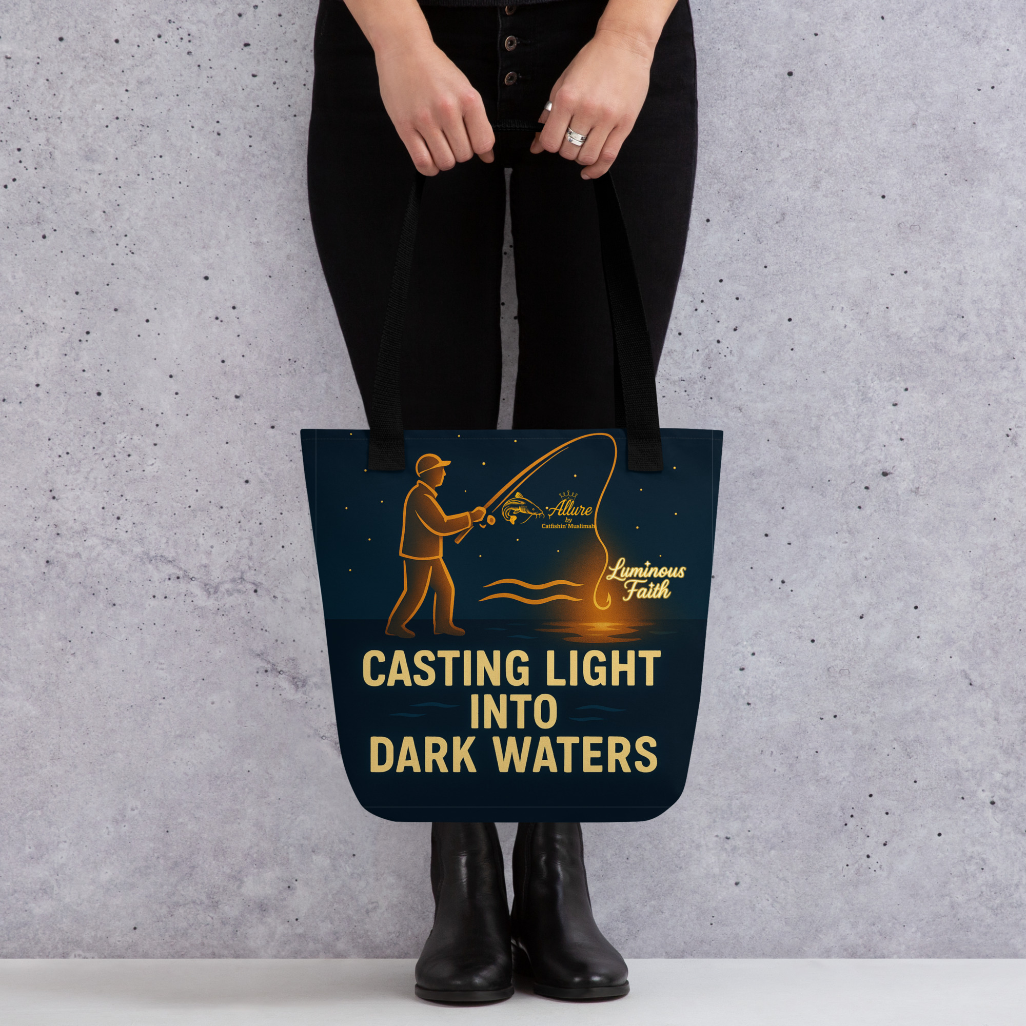 Carry your essentials. Cast your truth. This tote isn’t just a bag—it’s a beacon. Featuring the bold phrase “Casting Light Into Dark Waters” and a striking illustration of a figure casting into the darkness, it’s built for those who move through life with faith, courage, and light. Whether you’re heading to the dock, the market, or a mentoring session, this tote carries your gear and your message.